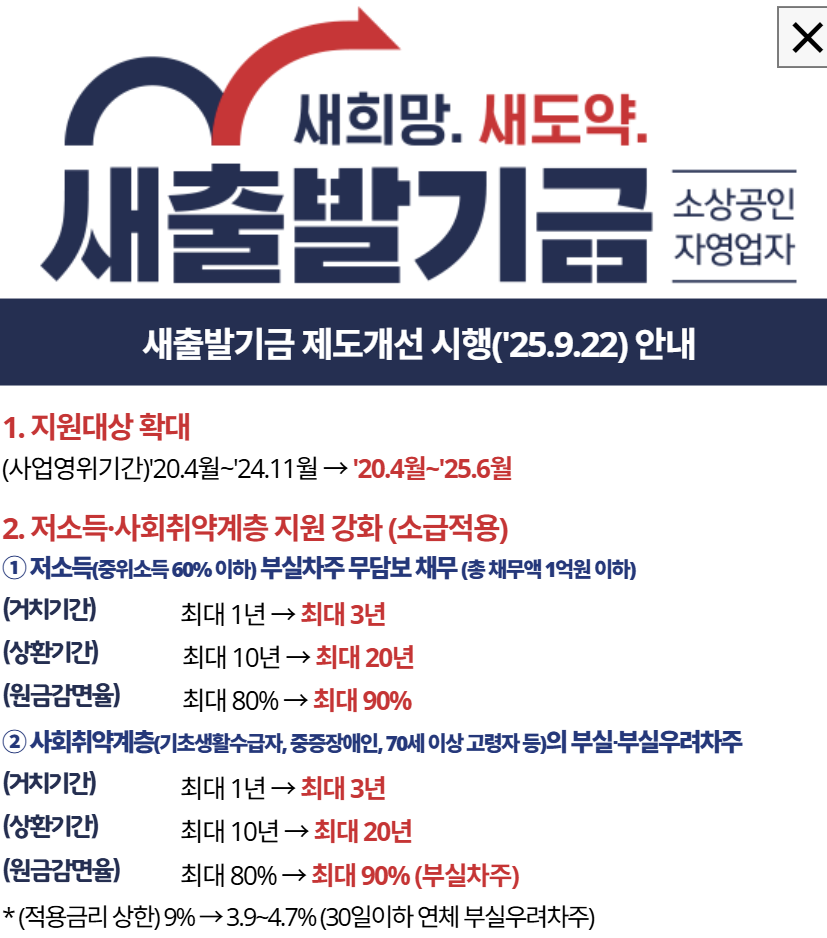 • 재기 성공 지원 강화: 폐업 소상공인이 새출발 기금 약정 체결 후 고용부나 중기부의 취업 및 재창업 프로그램을 성공적으로 수료하고 취업 또는 재창업에 성공할 경우, 채무조정 관련 공공정보를 즉시 해제할 수 있도록 지원합니다.